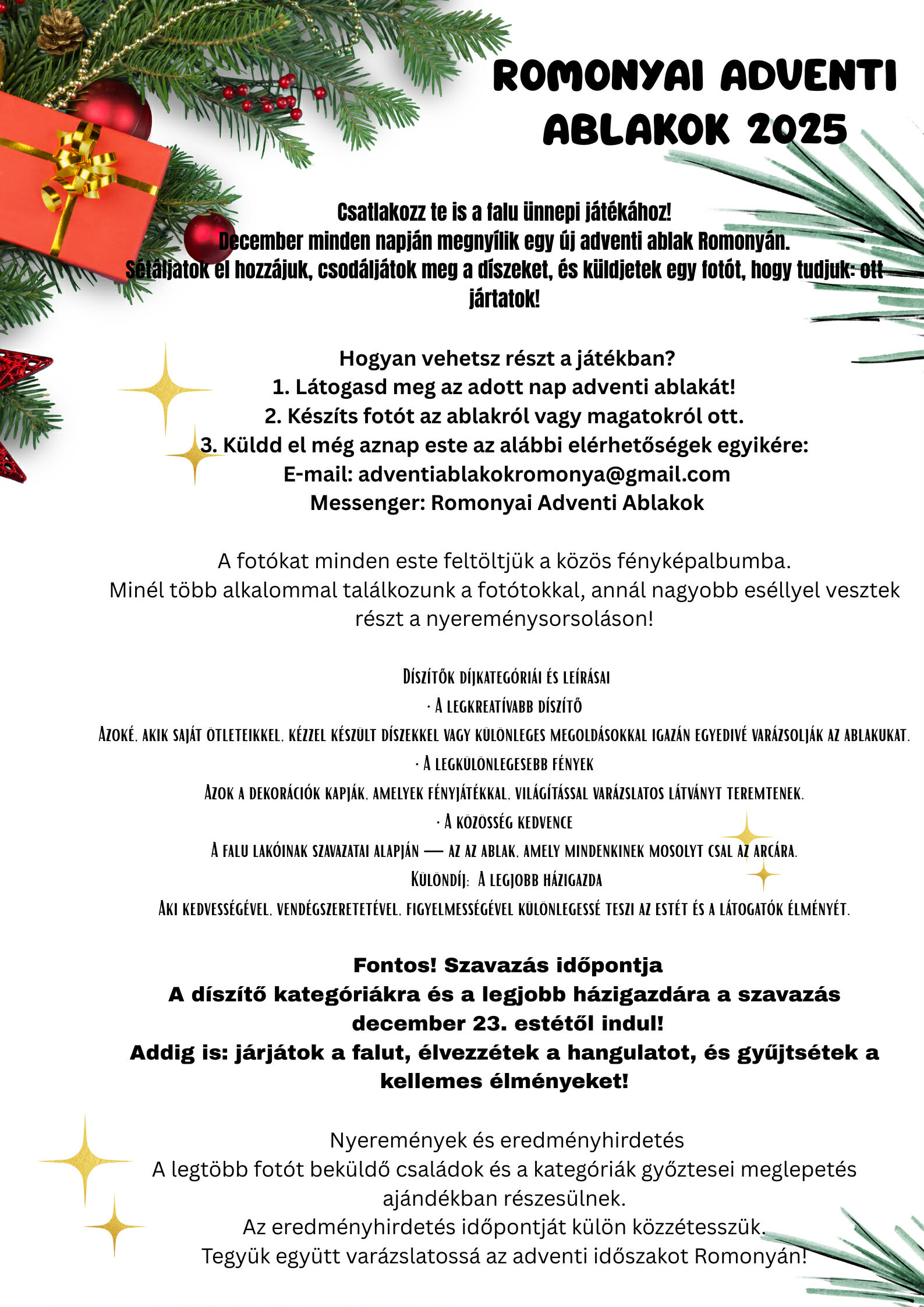 - Decemberben ismét kinyílnak az Adventi ablakok, amely örömet és fényt hoznak a közösségbe.