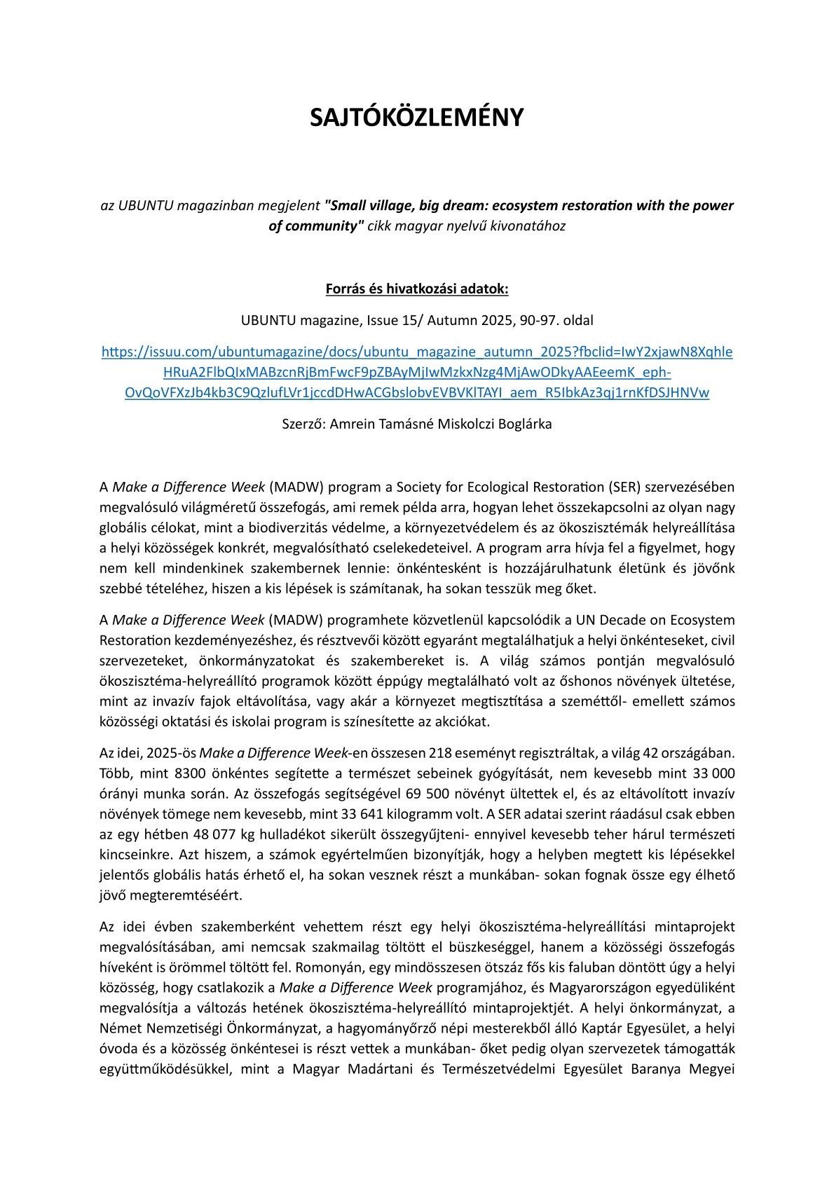 Egy apró baranyai falu, ahol az emberek nemcsak beszélnek a változásról, hanem tesznek is érte. Romonya neve most az Ubuntu Magazin hasábjain is felcsendül, mint Magyarország egyetlen települése, amely csatlakozott a világméretű „Make a Difference Week” – A Változás Hete – ökoszisztéma-helyreállító mintaprojektjéhez.