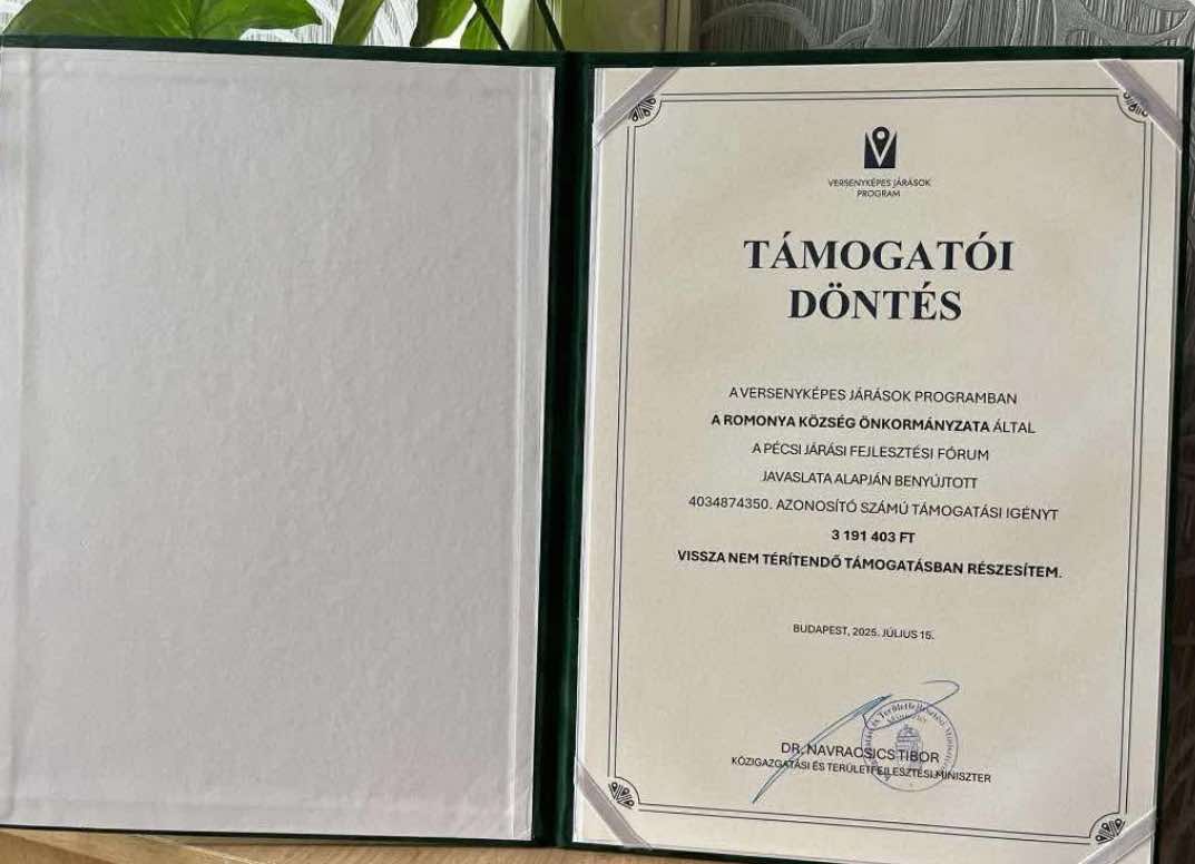 Nagy örömmel osztom meg, hogy Romonya község sikeresen nyert a Magyar Falu Program – Jedlik Ányos pályázatán, melynek keretében 7 154 528 Ft bruttó beruházási támogatásban részesültünk.